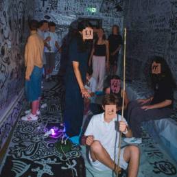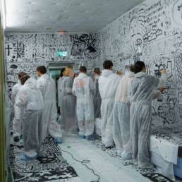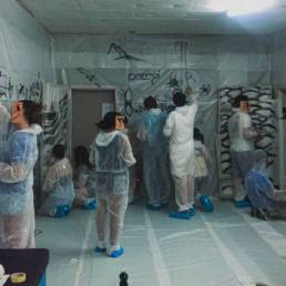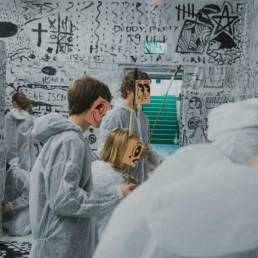 Inspiriert von der Künstlerin Yayoi Kusama bemalen sie dafür gemeinsam den ausgekleideten Schulbunker. Ab in den Maleranzug – fertig, los!
