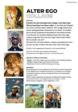 Als Abschluss der Unterrichtsreihe erstellen die SuS eine Alter-Ego-Collage für ihr Künstler:innen-Kollektiv-Klassenbuch.Durch das spielerische Kombinieren von Bildelementen mit ihrem Portrait können sie ihre dargestellte Identität beliebig modifizieren und weiterentwickeln. Sie lernen, mit gestalterischen Mitteln abstrakte Konzepte zu visualisieren und können ihr Wissen über Komposition anwenden und vertiefen.